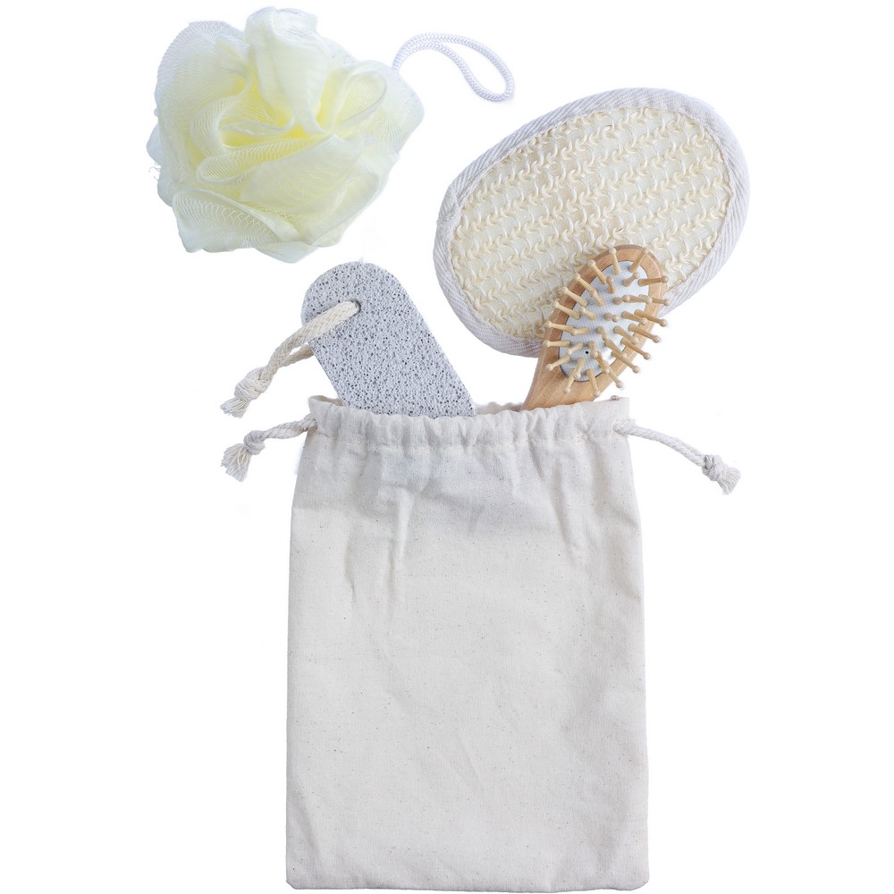 Das Badeset besteht aus sorgfältig ausgewählten, nachhaltigen Materialien: einer Bambusbürste, einem weichen Schwamm, einem Peelingschwamm und einem Bimsstein. Alle Komponenten sind liebevoll in einem praktischen Baumwollbeutel verpackt, der nicht nur umweltfreundlich ist, sondern auch stilvoll aussieht. Mit Abmessungen von 15 x 6,5 x 18 cm und einem Gewicht von nur 104 g ist das Set handlich und ideal für den täglichen Gebrauch.